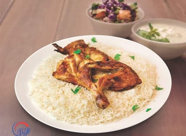 نصف دجاج مندي مع الأرز مع صوص طماطم حار